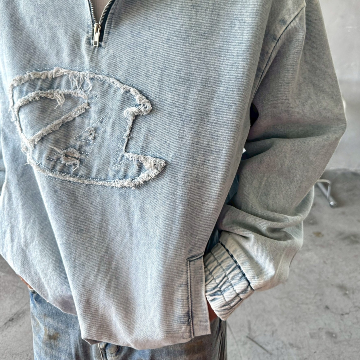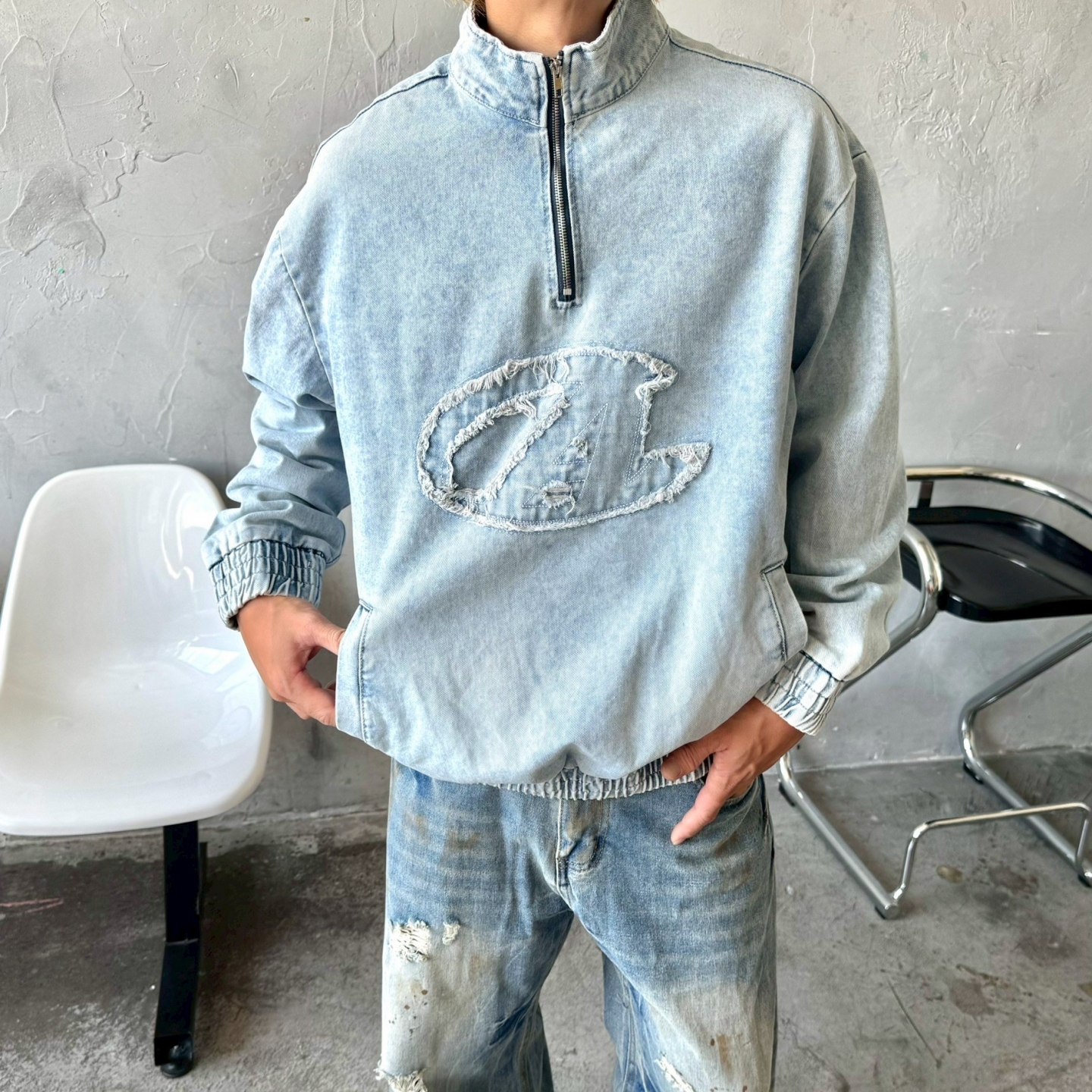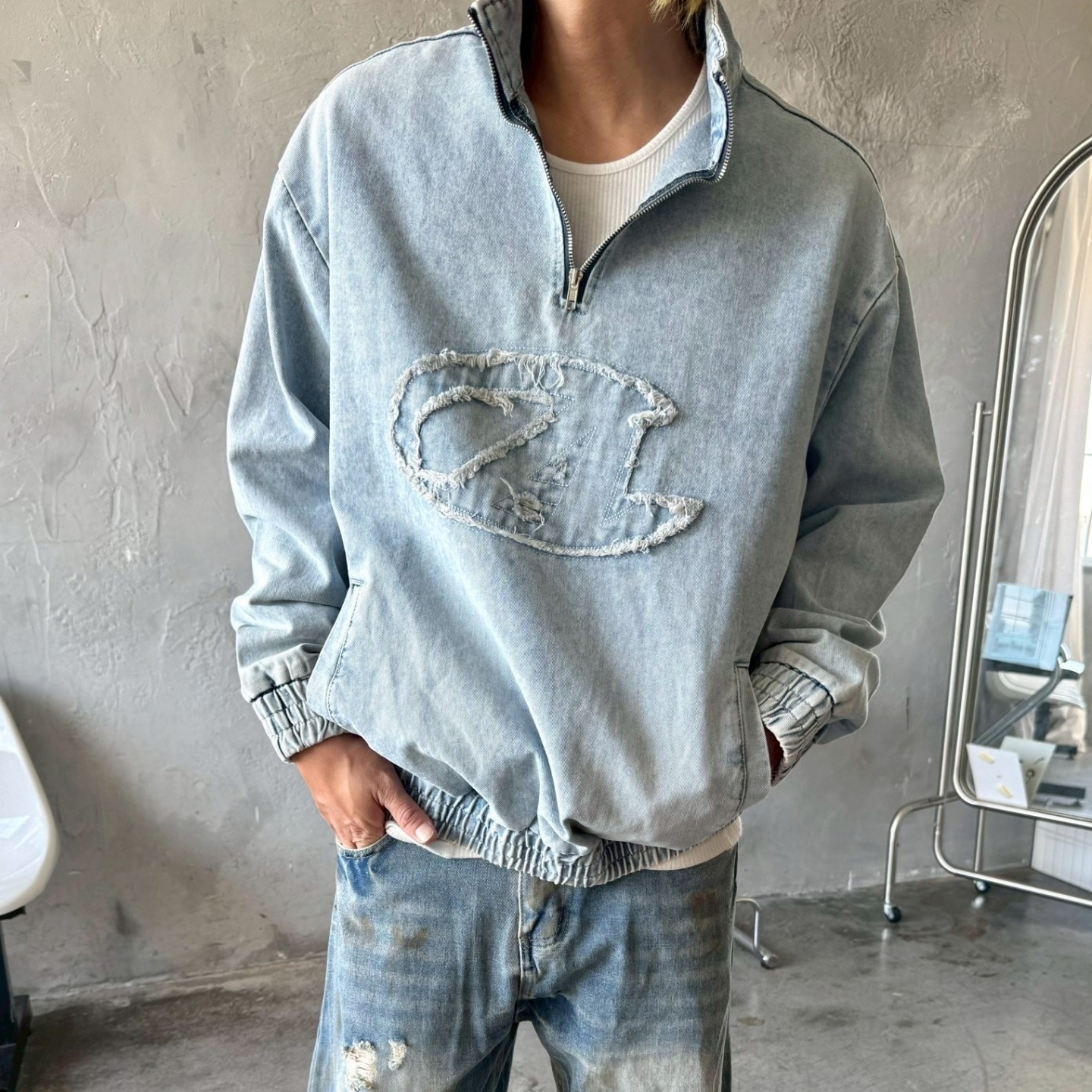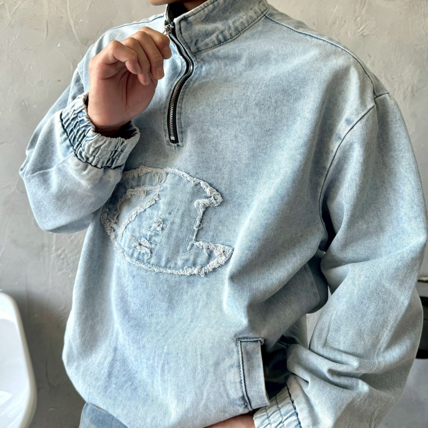 【預購】水洗牛仔半拉鍊貼布寬鬆套頭衫