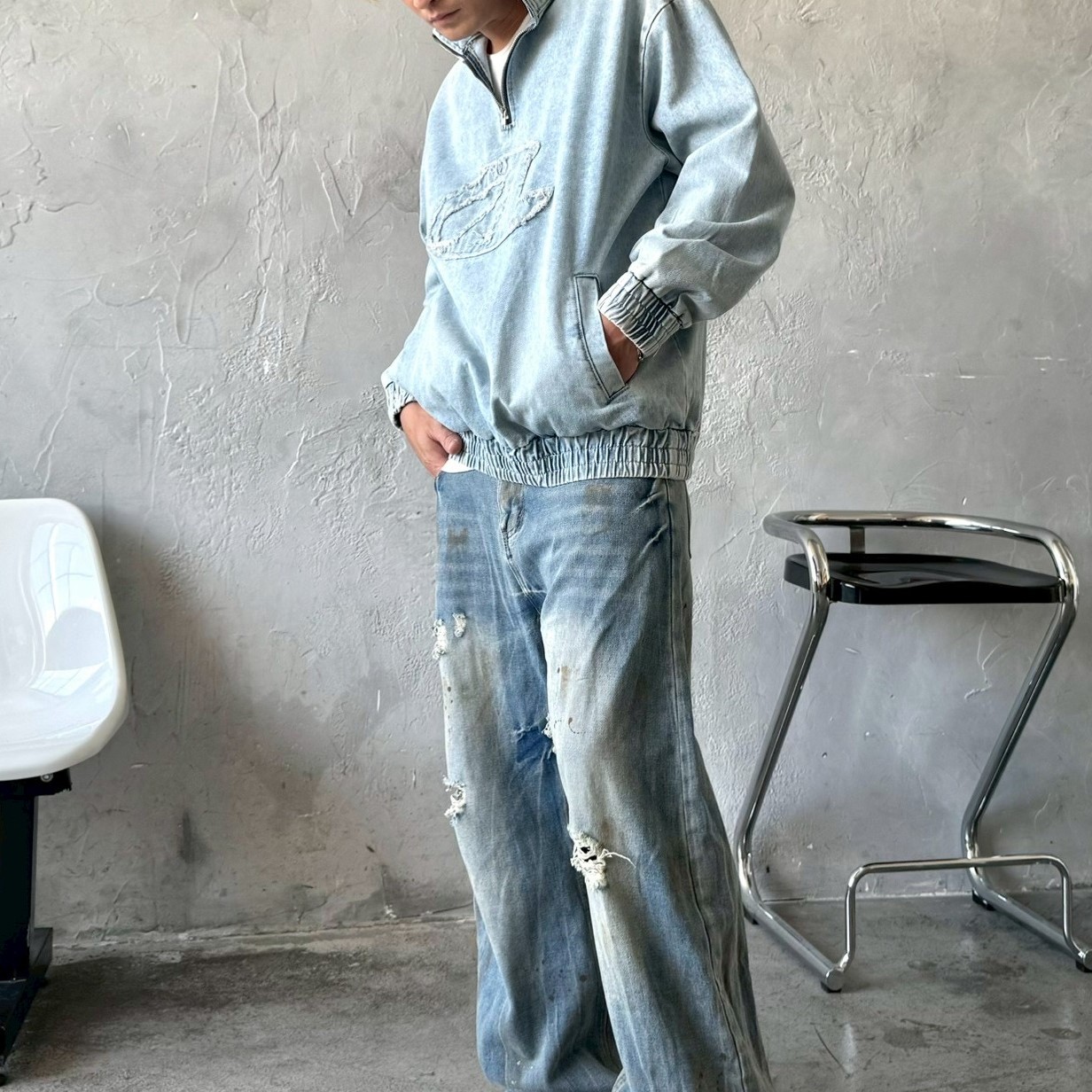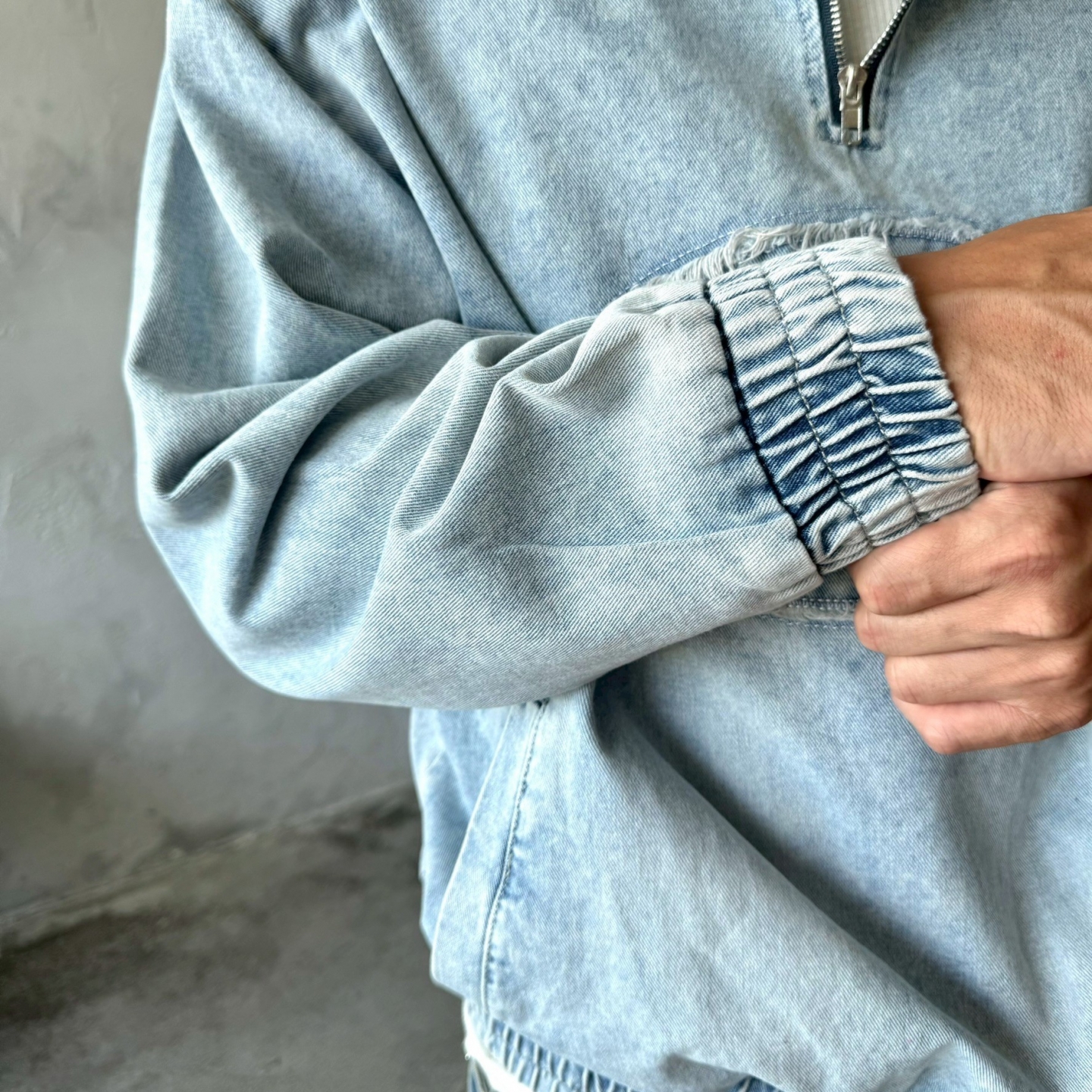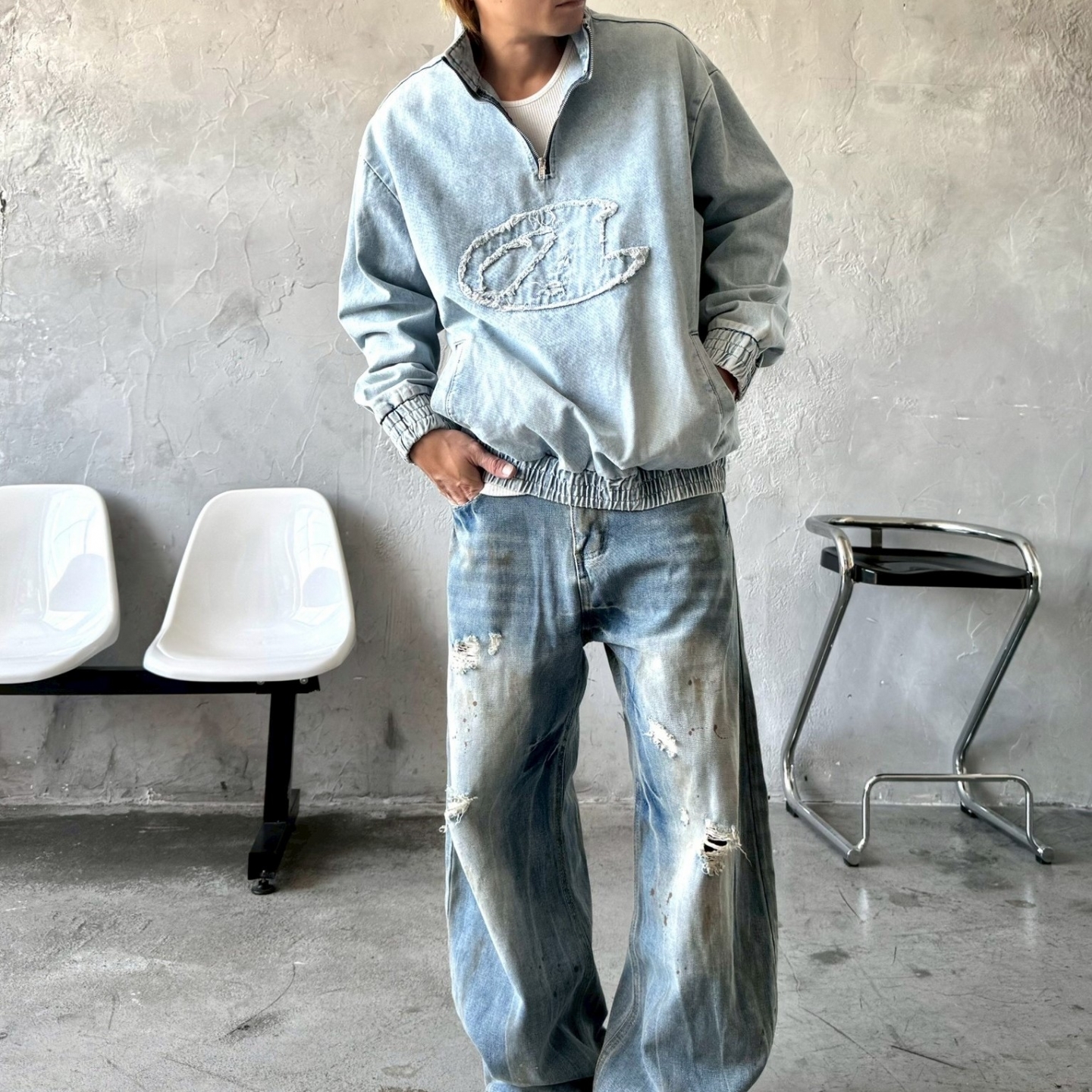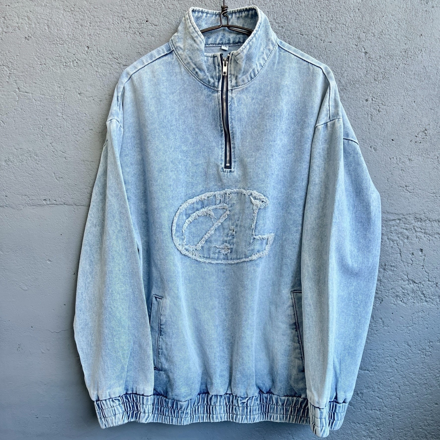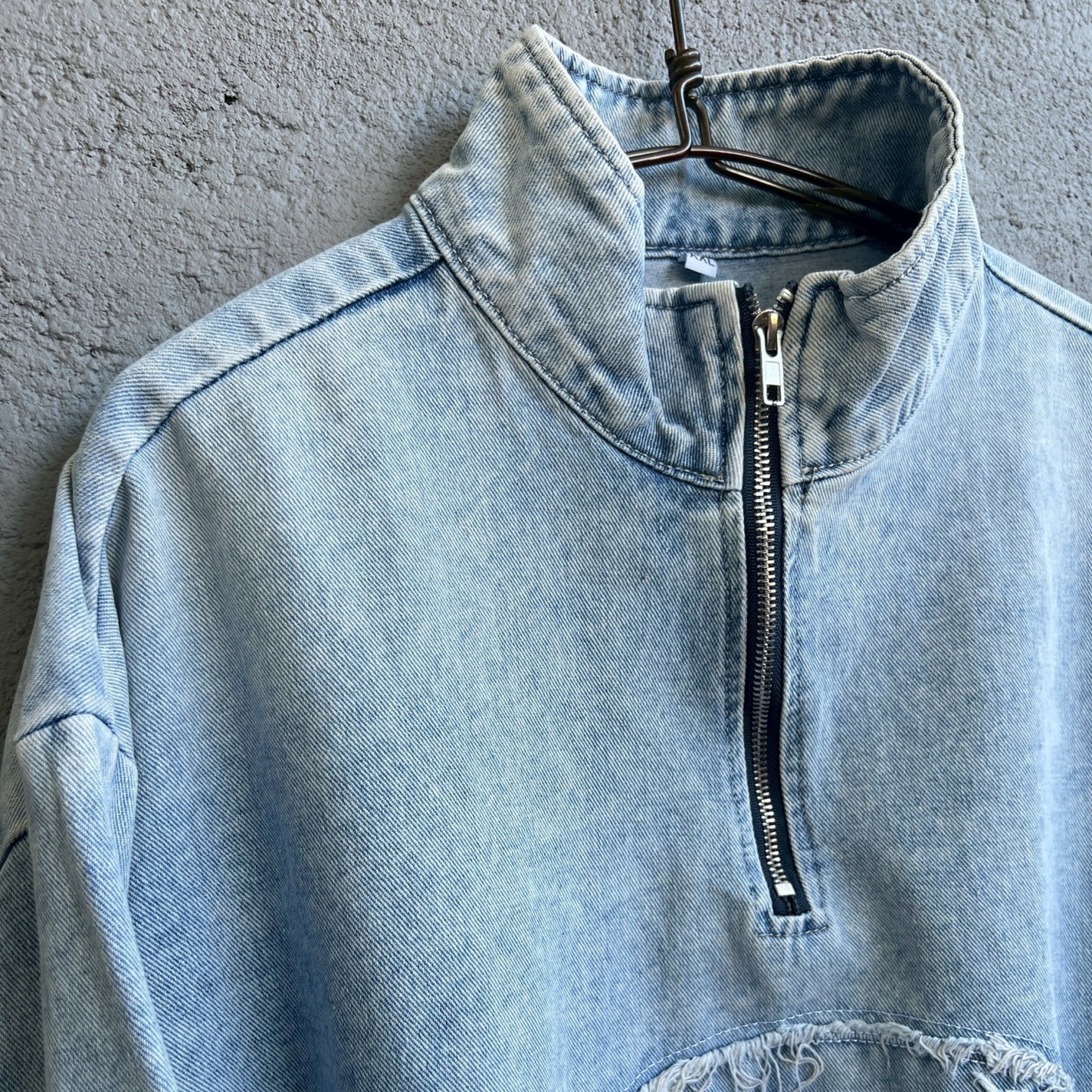 【預購】水洗牛仔半拉鍊貼布寬鬆套頭衫