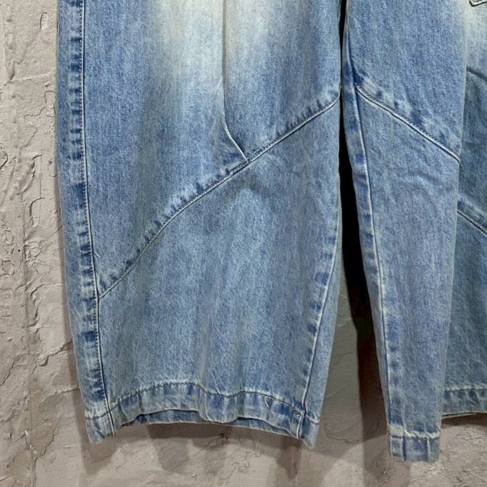 • 淺藍牛仔大口袋剪接工裝寬褲